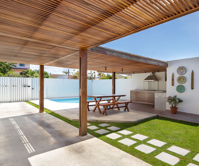 A proposta cria uma área externa com materialidade única. Os ambientes se diferenciam apenas pela marcação do piso e são conectados por uma única cobertura. A utilização da grama entre a casa e a área de lazer marca a transição entre as áreas internas e externas da casa, antes integradas pelo mesmo piso.